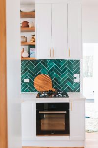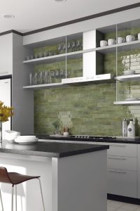 Tribeca glazed porcelain sage green tile (also available in Seaglass Mint) — glossy, artisanal rectangles that make a striking kitchen backsplash, especially when paired with the clean lines of a bright, minimal space.