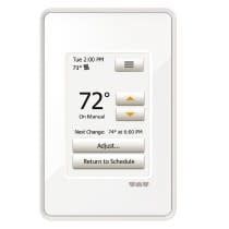 DITRA-HEAT-E-RT is a programmable touchscreen thermostat used to control the DITRA-HEAT-E-HK heating cables (either 120-Volt or 240-Volt). The thermostat features a 5 mA built-in Ground Fault Circuit Interrupter (GFCI) with indicator light and includes a floor temperature sensor. DITRA-HEAT-E-RT is operated via LCD touchscreen controls and features a pre-set schedule for convenience, which may be programmed to fit any schedule. Two heating cables may be connected to the thermostat, up to the total heating load limit of 15 Amp.